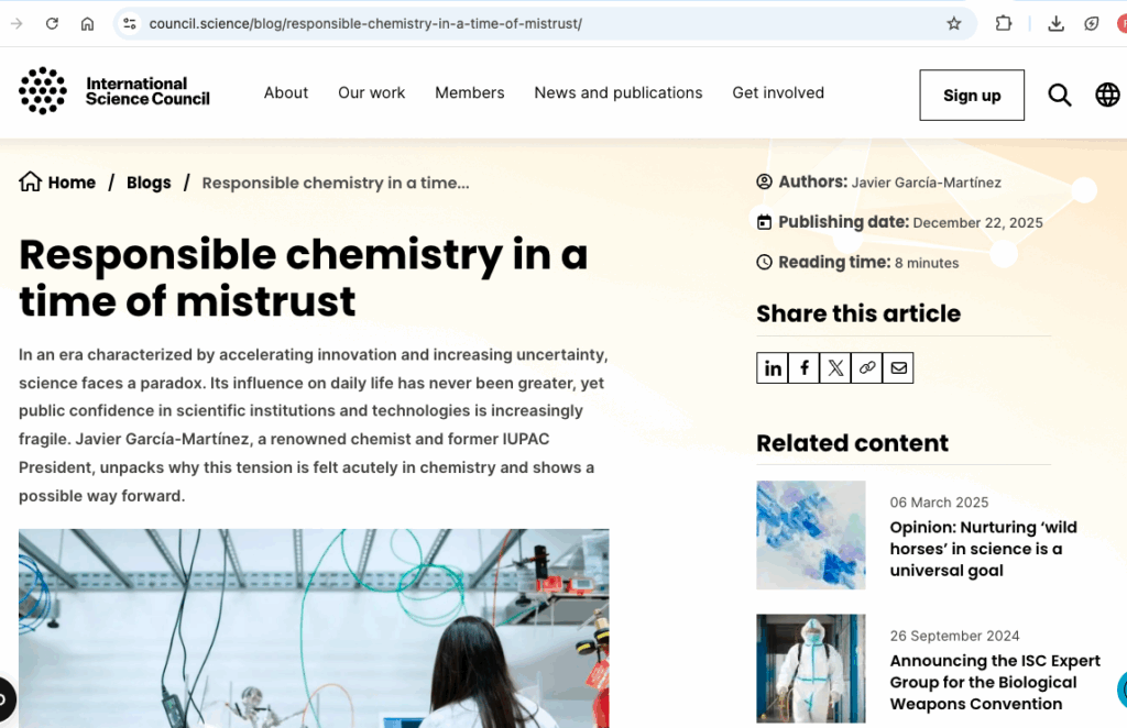 In an era characterized by accelerating innovation and increasing uncertainty, science faces a paradox. Its influence on daily life has never been greater, yet public confidence in scientific institutions and technologies is increasingly fragile. Javier García-Martínez, a renowned chemist and former IUPAC President, unpacks why this tension is felt acutely in chemistry and shows a possible way forward.
